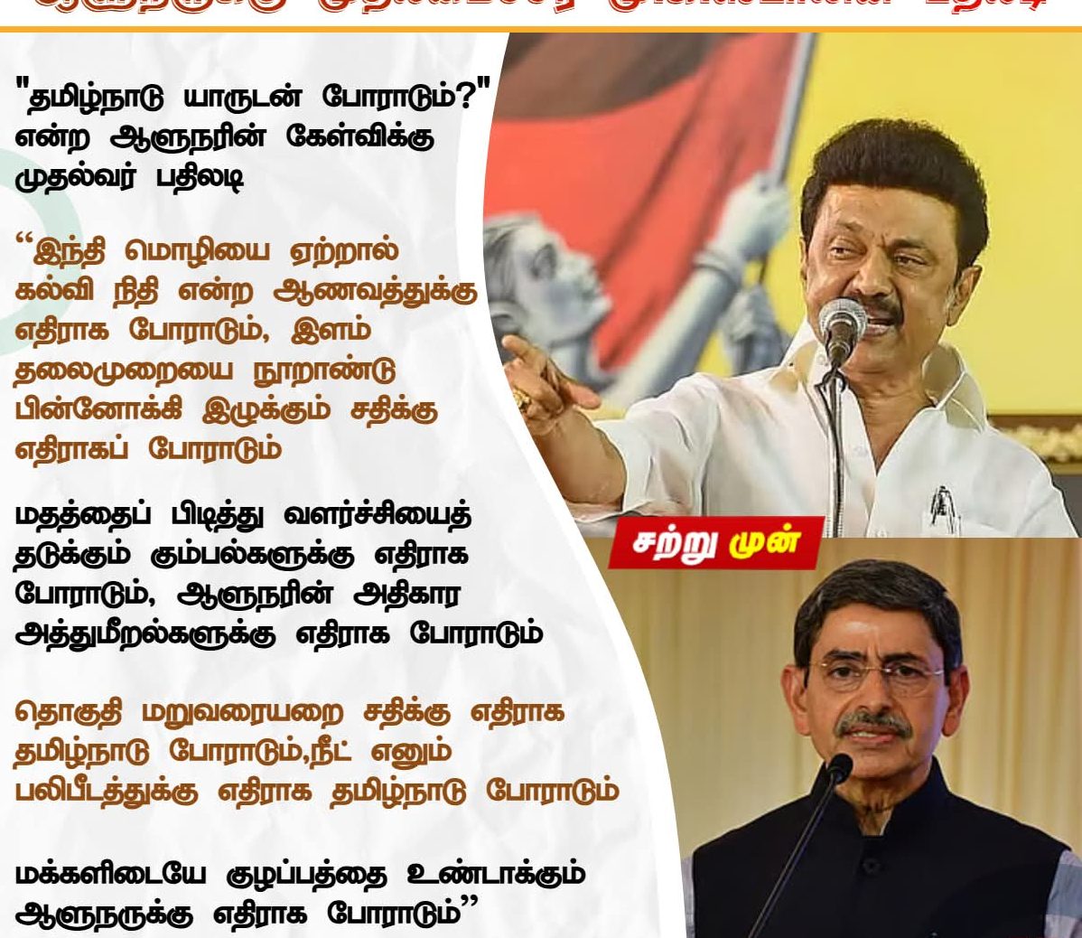 “மக்களிடையே குழப்பத்தை உண்டாக்கும் ஆளுநருக்கு எதிராக போராடும்“- ஆளுநருக்கு முதலமைச்சர் மு.க.ஸ்டாலின் பதிலடி!… ஆளுநருக்கு முதலமைச்சர் மு.க.ஸ்டாலின் பதிலடி!... NewsPoliticalTamilnadu By NBA 24X7 Last updated Oct 5, 2025 48 Share 48 Share