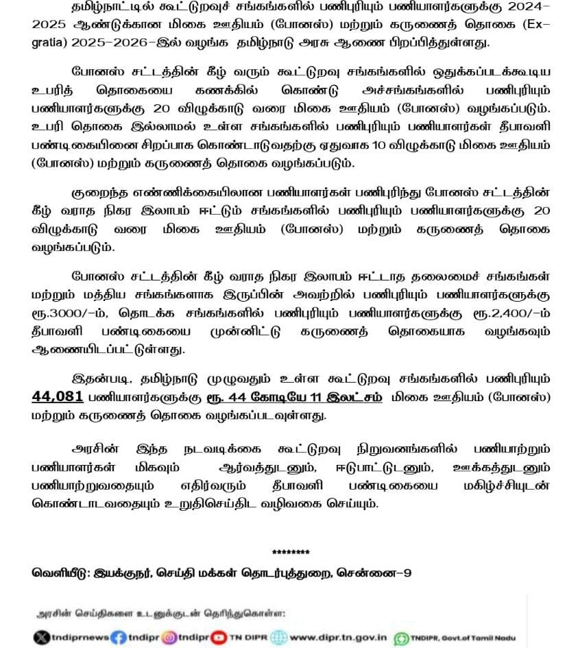 கூட்டுறவு சங்கப் பணியாளர்களுக்கு போனஸ் தமிழ்நாடு அரசு NewsPoliticalTamilnadu By NBA 24X7 On Oct 16, 2025 12 Share 12 Share