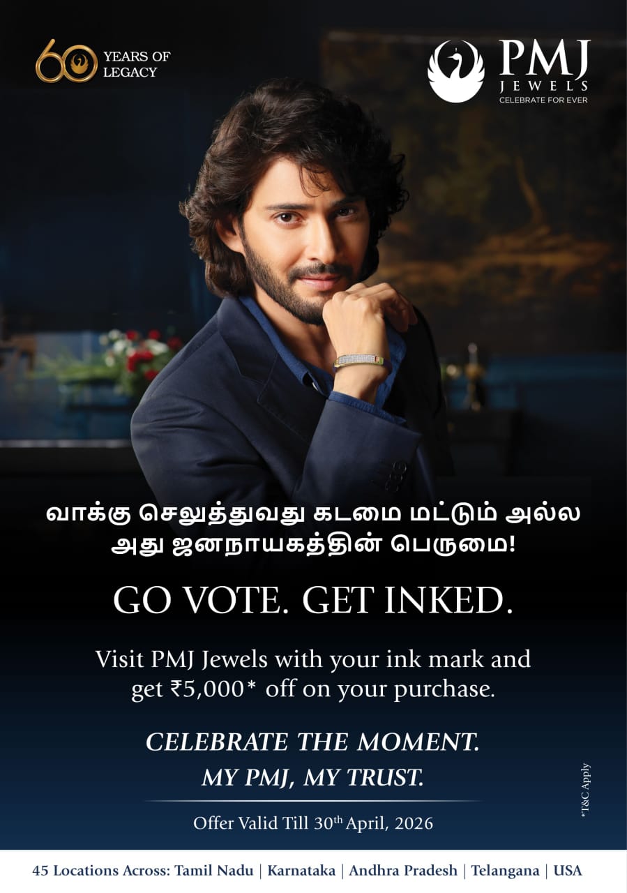 தேர்தலில் வாக்களிப்பதை ஊக்குவிக்கும் வகையில், பி.எம்.ஜே. ஜுவெல்ஸ் (PMJ JEWELS) கோ ஓட், கெட் இன்க்ட் (GO VOTE. GET INKED) என்ற பிரத்யேக சலுகை மூலம் ரூ.5000 உடனடி தள்ளுபடி அறிவித்துள்ளது. இந்த அறிவிப்பு பி.எம்.ஜே. ஜுவெல்ஸ் நிறுவனத்தின் தலைவர் குஷால் கங்காரியா, நிர்வாக இயக்குநர் தினேஷ் கங்காரியா மற்றும் தெலுங்கு சூப்பர் ஸ்டார் மகேஷ்பாபு ஆகியோர் மூலம் அறிமுகப்படுத்தப்பட்டது.