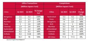 Chennai, October 03, 2024: Knight Frank India, in their latest report – India Real Estate: Residential and Office Q3 2024 (July – September 2024) cited that Chennai observed office space transactions of 2.6 mn sq ft during Q3 2024. The city witnessed a 35% increment in the transaction volume when compared to previous year.